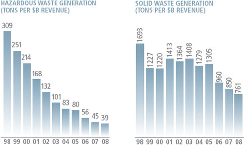 In our companywide effort to prevent pollution and preserve natural resources, we continue to work toward zero waste generation and the recycling or reuse of waste that has not been eliminated. Since 1998, Raytheon has reduced the amount of hazardous waste it generates by 87 percent per billion dollars of revenue. In 2008 alone, we reduced hazardous waste by 13 percent, to 39 tons per billion dollars of revenue. We generated approximately 990 tons of hazardous waste in total, of which 82 percent was recycled or otherwise diverted from a landfill.