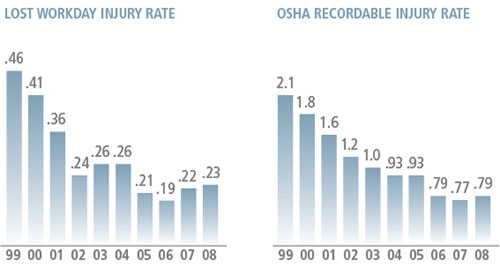 In moving toward our ultimate goal of an injury-free workplace, Raytheon tracks two Occupational Safety and Health Administration (OSHA) performance measures: recordable injury rate and the lost workday injury rate. The recordable injury rate is the number of recordable injuries and illnesses per 100 employees. The lost workday rate is the number of recordable injuries and illnesses involving days away from work per 100 employees.As the accompanying charts show, Raytheon has made significant progress by implementing best-in-class safety programs and processes. Since 1999, we have reduced our OSHA recordable injury rate by 62 percent and our lost workday injury rate by 50 percent. Since that time, over 7,100 fewer injuries took place than would have been expected if the baseline injury rates had continued. The 2008 injury rates are slightly higher than last year, but continue to demonstrate world-class performance. In 2008, our recordable injury rate increased 3 percent from 0.77 to 0.79 (from 564 injuries to 592 injuries) and our lost workday injury rate increased 4 percent from 0.22 to 0.23 (from 160 injuries to 173 injuries).