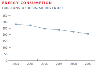 In 2009, energy consumption declined on an absolute basis by almost 3%, saving approximately $3 million in energy costs, and has declined 13% since 2002. When measured on a per dollar revenue basis, the company reduced its energy use 10% in 2009. Since 2002, the energy per dollar revenue reduction has been 38%.