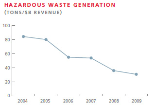 In our companywide effort to prevent pollution and preserve natural resources, we continue to work toward zero waste generation and the recycling or reuse of waste. Since 1998, Raytheon has reduced the amount of hazardous waste it generates by 89%, normalized by revenue. In 2009 alone, we reduced hazardous waste by 15% to 33 tons per $B of revenue. We generated approximately 872 tons of hazardous waste in 2009, of which 85% was recycled or otherwise diverted from a landfill.