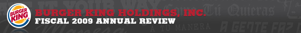 IntroductionIn fiscal 2009 we experienced a difficult operating environment with unprecedented volatile currency markets, significant commodity inflation and 25-year-high unemployment levels. In spite of these challenging macro-economic factors, we completed our sixth consecutive year of positive comp sales growth, achieved record revenues, generated strong cash flows and completed our strongest development year in almost a decade. We accomplished this through the commitment and dedication of our people who deliver on the cornerstones of our culture pillars of Bold, Accountable, Empowered, and Fun, each and every day. We continued to make progress across all of our business drivers: marketing, products, development and operations. And we launched our first ever Corporate Responsibility report titled BK Positive Steps®. The report details the steps we are taking in our corporate responsibility journey. Our marketing in fiscal 2009 included creative promotional campaigns and advertising that focused on the brand’s social relevance such as WHOPPER® Virgins, FLAME™ Body Spray and the Jonas Brothers concert tour sponsorship. Recognizing our marketing efforts, Ad Week named us as one of the top three industry-changing advertisers in the last three decades along with NIKE® and Budweiser in December 2008. On the product side, we introduced BK® Fresh Apple Fries – fresh cut, skinless apples sliced to resemble French fries. More than three million servings were sold in the first five weeks alone! And we cooked up new recipes such as the SteakhouseXT™ (Extra Thick) burger line, which has been especially designed for our new Batch Broiler and offers our guests the quality of casual dining with all the convenience and value of a quick-service-restaurant. We opened 360 net new restaurants during fiscal 2009, 28 percent higher than the prior year. And development outside of the U.S. and Canada represented over 90 percent of our net growth – the best international development year in the history of the company. Operations excellence also continued as a global priority. Our U.S. “Value for the Money” rating hit a new Best Ever score in June 2009 and our Operations Excellence Review scores reached all-time-highs across many of our key markets. Going forward, we expect our progress to continue. Our long-term strategies remain on course and we are committed to tactically respond to an ever changing consumer dynamic. |