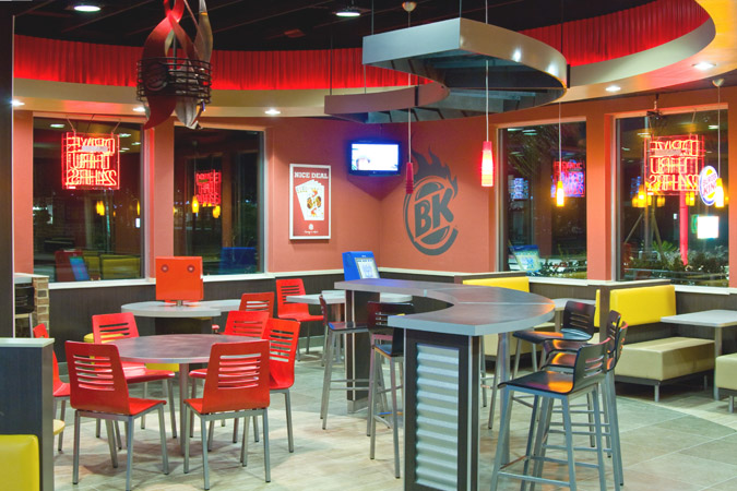 The King has new digs! Our 20/20 restaurant design of the future features a fresh, eye-catching sleek design unlike any other BURGER KING® restaurant. Before entering the restaurant, guests will see signage declaring that they have entered the “HOME OF THE WHOPPER®.” On the inside of the restaurant, the décor features a modern industrial pallet of metallic finishes and black accents, which is complimented by ceramic tile that looks like rustic wood and concrete, providing our guests with an in-restaurant experience and menu that rivals casual dining. |