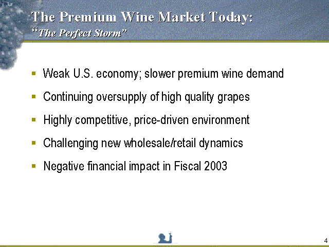 - The impact in the near-term has been a compression of revenue growth and margins for the industry. Smaller producers are being shaken out while larger producers, like Robert Mondavi, are surviving but not thriving, as you will see in our FY2003 results. We believe that several of “The Perfect Storm” factors are structural and to succeed and thrive in the future premium wine market, we are changing our business model.