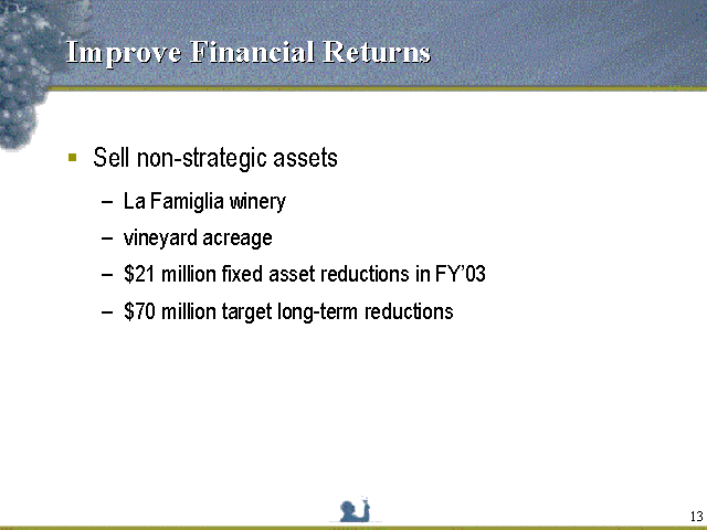 - We have steadily been making progress on sales of our non-strategic assets. In fiscal 2003, the sale of the La Famiglia facility in Oakville not the brand; the production facility and land plus the sale of acreage in the Central Coast region removed assets with $21 million in net book value from our balance sheet. We have identified additional assets for sale with net book value of approximately $45 to 50 million, which should get us to a total of about $65 to70 million in asset reductions.