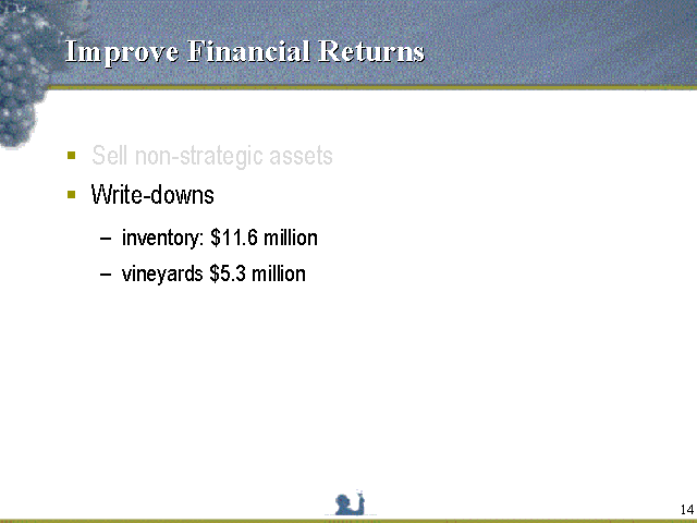 - We have also revalued a portion of our wine inventories in light of the slower-than-anticipated demand we’ve seen. Some will be sold at a loss; some have been written down to net realizable value. These write-downs coupled with our non-strategic asset sales have greatly strengthened our balance sheet.