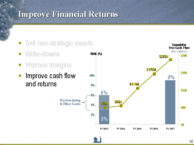 - In fiscal ’03, ROIC was 6%, excluding the effect of the restructuring and other costs taken. The combination of higher sales, lower production and SG&A costs, and a more efficient balance sheet will result in ROIC growing to about 9% by fiscal 07.