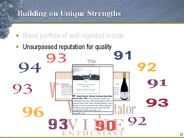 - [click] The wines in our portfolio are winning awards and high scores from leading critics every year. These are just a few of the 90-plus scores we’ve won recently. Consumers notice and so does the trade, and our reputation will help us succeed with the sales-building strategies we are pursuing.