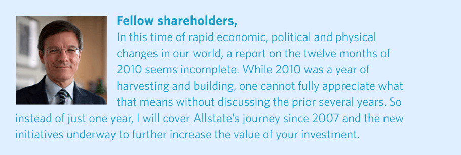 Leading Allstate is a privilege and an honor. In the year ahead, we will deliver value to shareholders and make an even bigger difference in the lives of those we protect. After all—we are The Good Hands® People!