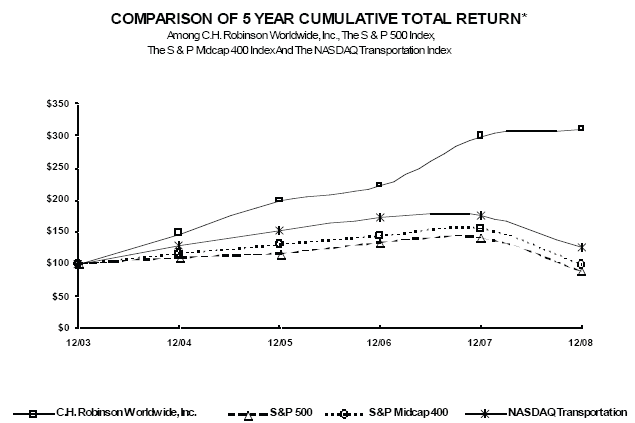 The graph below compares the cumulative five-year total return of holders of C.H. Robinson Worldwide, Inc.s common stock with the cumulative total returns of the S&P 500 index, the NASDAQ Transportation index, and the S&P Midcap 400 index. The graph tracks the performance of a $100 investment in our common stock and in each index (with the reinvestment of all dividends) from December 31, 2003 to December 31, 2008.