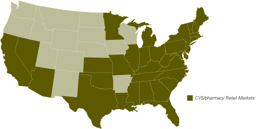 Expanding Our Reach Five years ago, CVS/pharmacy stores filled prescriptions in 4,098 stores in 26 states and the District of Columbia. Today, we fill prescriptions in 5,375 stores across 36 states and Washington, D.C. More than 1,300 stores—25 percent of our current store base—were built or acquired in new territories over the past five years. They have given us a substantial presence in some of America's fastest growing markets. |