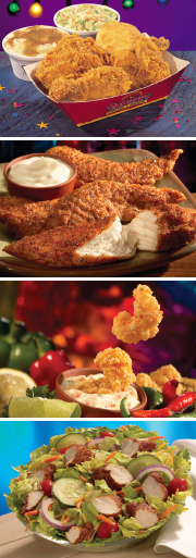 (Top to bottom) 3pc Chicken Combo, Popeyes Naked Chicken Strips™, Southwest Shrimp and Garden Salad with Popeyes Naked Chicken Strips™