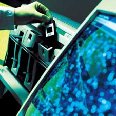 The key to Affymetrix GeneChip technology is a manufacturing process that uses photolithography to build hundreds of thousands of DNA sequences on small glass chips. This process borrows from semiconductor industry technology, and thus, also benefits from the principles of Moores Law, which states that the computing power of semiconductor chips doubles every 12 to 18 months. In a similar fashion, Affymetrix has been able to increase the genetic information on its DNA probe arrays from 250 genes per chip in 1994 to over 12,000 genes per chip today by shrinking the feature size on its chips. In the same timeframe, the price per data point has decreased by a factor of more than ten. Consequently, GeneChip technology is uniquely suited for facilitating the high information content studies that are becoming the standard in genomics research.