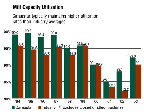Over the past five years, 37 recycled boxboard paper machines, representing more than 1.7 million tons, or 20 percent, of total industry capacity, have been shut down. Caraustar shut down six machines with a combined capacity of 370,000 tons. In 2003 alone, Caraustar permanently closed machines in Halifax, VA, and Lockport, NY, and indefinitely idled another machine in Rittman, OH.