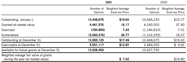 | NOTE 16: LONG-TERM INCENTIVE PLANS The Company established the Knight/Trimark Group, Inc. 1998 Long-Term Incentive Plan and the Knight/Trimark Group, Inc. 1998 Nonemployee Director Stock Option Plan (together, the “Plans”) to provide long-term incentive compensation to selected employees and directors of Knight Trading Group and its subsidiaries. The Plans are administered by the compensation committee of the Company’s Board of Directors, and allow for the grant of options, restricted stock and restricted stock units, as defined by the Plans. Including a stockholder-approved increase in the number of shares reserved under the Plans by three million in May 2001, the maximum number of shares of Class A Common Stock reserved for the grant of options under the Plans is 27,819,000, subject to adjustment. The maximum number of restricted stock and restricted stock units which may be issued under each of the Plans is 3,000,000, which includes a two million share increase reserved under the Plans that was approved by stockholders in May 2001. In addition, the Plans limit the number of shares which may be granted to a single individual, and the Plans also limit the number of shares of restricted stock that may be awarded. It is the Company’s policy to grant options for the purchase of shares of Class A Common Stock at not less than market value, which the Plans define as the average of the high and low sales prices on the date prior to the grant date. Options and awards generally vest over a three or four-year period and expire on the fifth or tenth anniversary of the grant date, pursuant to the terms of the agreements. The Company has the right to fully vest employees in their option grants and awards upon retirement. The following is a reconciliation of option activity for the Plans for the years ended December 31, 2001 and 2000, and a summary of options outstanding and exercisable at December 31, 2001: ![]() ![]() The Company granted a total of 72,240 restricted shares of Class A Common Stock to certain employees of the Company under the 1998 Long-Term Incentive Plan and recorded compensation expense of $173,599 during 2001 for the fair value of the shares, which has been included in Compensation and Benefits in the Consolidated Statements of Income. The unamortized portion of the restricted shares is recognized as compensation expense over the vesting period. The restricted stock requires future service as a condition of the underlying shares of common stock. The Company applies Accounting Principles Board Opinion No. 25, Accounting for Stock Issued to Employees and related interpretations in accounting for its stock option plans. Accordingly, no compensation expense has been recognized for the fair values of the options granted to employees. Had compensation expense for the Company’s options been determined based on the fair value at the grant dates in accordance with Statement of Financial Accounting Standards No. 123, Accounting for Stock-Based Compensation, the Company’s net income and earnings per share amounts for the years ended December 31, 2001, 2000 and 1999 would have been as follows: The fair value of each option granted is estimated as of its respective grant date using the Black-Scholes option-pricing model with the following assumptions: ![]() |