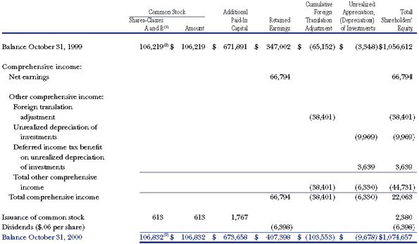 (1) Share and per share information has been adjusted to give effect to a two-for-one common stock split effective April 24, 1998. (2) Includes 3,555 shares (in thousands) of Class B common stock. See accompanying notes to consolidated financial statements. |