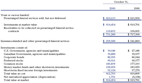 (5) PREARRANGED FUNERAL SERVICES The following summary reflects prearranged funeral services sold, but not yet delivered, which are funded with trusts, escrow accounts and insurance and related prearranged funeral trust fund and escrow account balances. The trustand insurancefunded balances are not reflected in the accompanying consolidated financial statements. Amounts which represent the Companys voluntary deposits into escrow accounts in those jurisdictions where trust or escrow arrangements are neither statutorily nor contractually required aggregated $4,203 and $14,347 as of October 31, 2000 and 1999, respectively, and are classified as long-term investments. Amounts deposited in the trust funds and escrow accounts and funded through insurance are available to the Company when the services are performed. Funds held in trust or escrow are invested, and earnings (including net realized capital gains) realized on irrevocable trust funds and escrow accounts are deferred until the underlying funeral service is delivered, in accordance with the Companys change in accounting method effective November 1, 1998. Under the Companys previous accounting method, earnings of $26,463 were included in funeral revenue for fiscal year 1998.