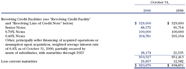 In April 1997, the Company completed the syndication of a $600,000 revolving credit facility (Revolving Credit Facility). The Revolving Credit Facility matures on April 30, 2002 and contains a facility fee which was 22.5 basis points on October 31, 2000. Borrowings bear interest at the lead lending banks prime rate or certain optional rates at the Companys election. Under this agreement $529,000 was outstanding with weighted average interest rates of 6.46 percent and 5.63 percent as of October 31, 2000 and 1999, respectively, which includes the effect of the interest rate swap agreement discussed below. As of October 31, 2000 and 1999, the carrying value of these borrowings, including accrued interest, was $529,000 and $533,086, respectively, whereas the fair value was $512,193 and $524,924, respectively. Additionally, as of October 31, 2000 and 1999, the Company had outstanding letters of credit in the amount of $5,551 and $4,813, respectively, resulting in $65,449 and $66,187, respectively, of availability under its Revolving Credit Facility. In order to hedge a portion of the interest rate risk associated with its variable-rate debt, during the first quarter of 1999 the Company entered into a three-year interest rate swap agreement involving a notional amount of $200,000. This agreement which became effective March 4, 1999, effectively converted $200,000 of variable-rate debt bearing interest based on three-month LIBOR to a fixed rate based on the swap rate of 4.915 percent. The estimated fair value of the interest rate swap as of October 31, 2000 and 1999, based on quoted market prices, was $4,693 and $6,090, respectively. As of October 31, 2000 and 1999, the Company had $529,000 of outstanding borrowings under its $600,000 Revolving Credit Facility, $329,000 of which was not hedged by the interest rate swap agreement and was subject to a weighted average short-term variable interest rate of 7.16 percent and 5.92 percent, respectively. Additionally, the Company has available with a separate financial institution an uncollateralized and uncommitted revolving line of credit (Revolving Line of Credit Note) used to support the interim cash funding for advances to be made under the Revolving Credit Facility in amounts less than $5,000. Borrowings under the Revolving Line of Credit Note are limited to $10,000, bear interest at the lending banks cost of funds rate and are payable on demand. There were no amounts outstanding under the Revolving Line of Credit Note as of October 31, 2000 and 1999. On December 21, 1993, the Company issued $50,000 of uncollateralized senior notes, bearing interest at a rate of 6.04 percent and maturing on November 30, 2003. Principal payments of $7,143 are due each year; the first such payment was made on November 30, 1997, and the final payment is due on November 30, 2003. On November 7, 1994, the Company issued $75,000 of uncollateralized senior notes with an average maturity of seven years and a weighted average interest rate of 8.44 percent. A principal payment of $15,000 was made on May 1, 1998. The remaining notes have a weighted average interest rate of 8.49 percent, and principal payments are due as follows: $16,667 on each of November 1, 2000, 2001 and 2002, and $10,000 on November 1, 2006. As of October 31, 2000 and 1999, the carrying value of the Companys senior notes, including accrued interest, was $91,822 and $99,145, respectively, whereas the fair value was $74,853 and $91,137, respectively. In December 1996, the Company issued $100,000 of unsecured, unsubordinated debt securities in the form of 6.70 percent Notes due in 2003. Net proceeds were approximately $99,400, of which $96,800 was used to reduce balances outstanding under the Companys revolving credit facilities, with the remaining $2,600 used for acquisitions and general corporate purposes. As of October 31, 2000 and 1999, the carrying value of these notes, including accrued interest, was $102,773, whereas the fair value was $65,573 and $84,553, respectively. In April 1998, the Company issued $200,000 of 6.40 percent Remarketable Or Redeemable Securities (ROARS) due May 1, 2013 (remarketing date May 1, 2003). The ROARS were priced to the public at 99.677 percent to yield 6.476 percent. Net proceeds were approximately $203,631, including the payment made to the Company by the remarketing dealer for the right to remarket the securities after five years. The proceeds were used to reduce balances outstanding under the Companys revolving credit facilities. The net effective rate to the Company, assuming the securities are redeemed by the Company after five years, is 5.77 percent. If the securities are remarketed after five years, the net effective rate for the remaining term will be 5.44 percent (10-year Treasury rate, fixed upon initial issuance of the ROARS) plus the Companys then current credit spread. If the ROARS are redeemed by the Company on May 1, 2003, a principal payment of $200,000 will be required. As of October 31, 2000 and 1999, the carrying value of these notes, including accrued interest and the unamortized portion of the option premium, was $211,146 and $211,528, respectively, whereas the fair value was $136,444 and $175,366, respectively. The bank loan agreements and senior note agreements contain various restrictive covenants that limit consolidated funded indebtedness, indebtedness of subsidiaries, the sale of assets to entities outside the consolidated group and the payment of dividends on, and repurchases of, the capital stock of the Company. Additionally, the bank loan agreements contain change of control provisions. The Company is also required to maintain specified financial ratios related to net worth and fixed charges. Scheduled principal payments and maturities of the Companys long-term debt for the fiscal years ending October 31, 2001 through October 31, 2005, excluding the Revolving Credit Facility and assuming the ROARS are redeemed by the Company on May 1, 2003,
