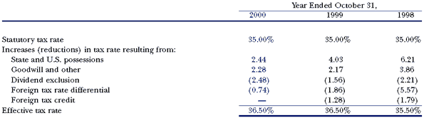 For the year ended October 31, 2000, the Companys earnings before income taxes generated from properties in foreign jurisdictions were negative. For the years ended October 31, 1999 and 1998, approximately 4 percent and 5 percent, respectively, of the Companys earnings before performance-based stock options and income taxes were generated from properties in foreign jurisdictions. The Company has not recognized a deferred tax liability of approximately $10,000 for the undistributed earnings of non-U.S. subsidiaries because the Company currently considers these earnings to be reinvested indefinitely. |