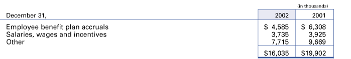 Depreciation expense totaled approximately $11,280,000, $8,468,000 and $7,906,000 for the years ended December 31, 2002, 2001 and 2000, respectively. At December 31, 2002, approximately $494,000 was included in accounts payable for capital expenditures. At December 31, 2001, approximately $2,782,000 and $612,000 was included in accounts payable and accrued liabilities, respectively, for capital expenditures. Note 7. Accrued