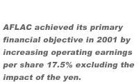 AFLAC Japan Adapting to Change2001 was a year of change for AFLAC Japan. On January 1, 2001, the third sector of the Japanese insurance industry the sector in which AFLAC Japan primarily operates was deregulated. As we anticipated, deregulation brought more competition to the market as many insurance companies or their subsidiaries began selling third-sector products, specifically cancer life insurance. However, the first year of deregulation ended the same way it began we were the number one seller of cancer life insurance in Japan. We believe that our operating efficiency is a key reason why we have maintained our leadership in a more competitive environment. Our expense structure in Japan allows us to offer the best products at the best price and to pay the highest commissions to our sales force. Simply put, AFLAC Japan's products offer the best supplemental insurance value in the market. With that value proposition so important to our ongoing success, we continued to improve our product line in 2001. One highlight of the year was the introduction of 21st Century Cancer Life. This dramatically redesigned product offers consumers a wide range of benefit choices. Introduction of this product marked the first time that consumers could customize the type of cancer life coverage they wanted to purchase. Although we had some initial difficulty selling the product due to its complexity, we streamlined its design and packaging, and our sales results showed improvement. We believe 21st Century Cancer Life is the best cancer insurance product in the market, and independent research shows that others agree with us. A special report on life insurers in the July 9, 2001, issue of Toyo Keizai Weekly ranked AFLAC's 21st Century Cancer Life as the best cancer insurance product available. Equally impressive, our cancer life policy was identified as the second-best product in the entire Japanese life insurance market. The same report also ranked AFLAC as the number one company consumers would turn to if they needed to replace an existing product. We also took action in other product areas. In the second quarter of the year, we discontinued selling a product in our annuity line, which had been sold as business insurance. We stopped selling that product because its profitability did not meet our targets, and we did not want to sacrifice profitability for sales. In July, we became the first life insurer to introduce an accident policy in Japan. And late in the year, we revised our popular Rider MAX product by improving its benefits. As we look ahead, we believe we will retain our outstanding reputation for product innovation. In fact, AFLAC Japan was again ranked as the number one life insurance company in terms of product development in Japan, according to a survey published in January 2002 by the Nikkei Kinyu, a daily financial newspaper. In addition to product development, we also focused on further enhancing our already strong distribution system. Overall, our ongoing objective is to gain better access into the huge market of small to medium-size businesses in Japan. To accomplish that objective, we continued to recruit new agencies, especially individual agencies. We also worked very closely with our marketing alliance partner, Dai-ichi Mutual Life, Japan's second largest life insurance company. In April 2001, Dai-ichi Life's sales force began selling our newest cancer life policy. As the year progressed, Dai-ichi Life's sales gained significant momentum. We believe Dai-ichi Life's interest in selling our product, rather than developing its own policy, indicates the strength of AFLAC's market position and reputation. And Dai-ichi Life's success at selling our policy clearly points to the need for and quality of 21st Century Cancer Life. |