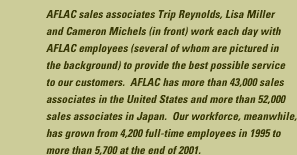 AFLAC Incorporated, a Fortune 500 company, is traded on the New York Stock Exchange under the symbol "AFL" and is included in the Standard & Poor's 500 Index. In January 2002, AFLAC was the number one insurance company in Fortune magazine's annual listing of "The 100 Best Places to Work for in America" and was included in the overall listing for the fourth year in a row. In February 2002, Forbes ranked AFLAC 112th in its "Platinum 400" list of "America's Best Big Companies." We were also included in Fortune's March 2002 list of the most admired insurance companies. AFLAC is rated "AA" by Standard & Poor's and "Aa3" by Moody's for financial strength. Fitch Ratings also rates AFLAC "AA" for financial strength. A.M. Best assigns AFLAC an "A+, Superior" rating for financial strength and operating performance. |