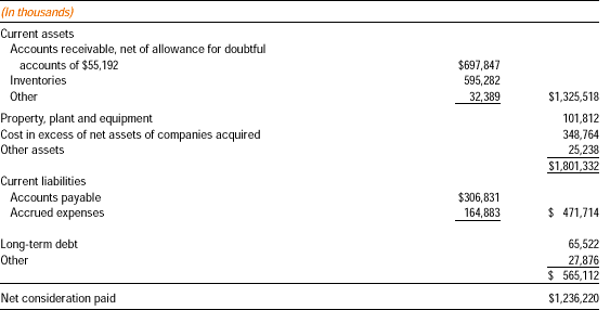 The cost of each acquisition has been allocated among the net assets acquired on the basis of the respective fair values of the assets acquired and liabilities assumed. The preliminary purchase price allocations for the 2000 acquisitions are subject to adjustment in 2001 when finalized. For financial reporting purposes, the acquisitions are accounted for as purchase transactions in accordance with Accounting Principles Board Opinion No. 16, "Business Combinations." Accordingly, the consolidated results of the company in 2000 include these companies from their respective dates of acquisition. The aggregate consideration paid for all acquisitions exceeded the net assets acquired by $356,488,000 and $303,326,000 in 2000 and 1999, respectively.