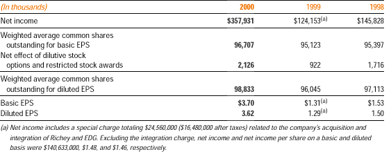 Had stock-based compensation costs been determined as prescribed by SFAS No. 123, “Accounting for Stock-Based Compensation,” net income would have been reduced by $6,144,000 ($.08 per share on a diluted basis) in 2000, $4,143,000 ($.03 per share on a diluted basis) in 1999, and $6,650,000 ($.04 per share on a diluted basis) in 1998.