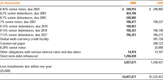 In February 2001, the company entered into a 364-day $625,000,000 credit facility (the “364-day facility”) which expires in February 2002 and a three-year revolving credit agreement providing up to $625,000,000 of available credit. These credit facilities replaced the previously existing 364-day credit facility and the global multi-currency credit facility. The 364-day facility and three-year revolving credit facility bear interest at the applicable eurocurrency rate plus a margin of .75% and .725%, respectively. The company pays the banks a facility fee of .125% and .15% per annum, respectively, related to the 364-day facility and three-year revolving credit facility. In addition, during the first quarter of 2001, the company completed the sale of $1,523,750,000 principal amount at maturity of zero coupon convertible senior debentures (the “convertible debentures”) due February 21, 2021. The convertible debentures were priced with a yield to maturity of 4% per annum and may be converted into the company’s common stock at a conversion price of $37.83 per share. Holders of the convertible debentures may require the company to repurchase the convertible debentures (at the issue price plus accrued original issue discount through the date of repurchase) on February 21, 2006, 2011, or 2016. The company, at its option, may redeem all or part of the convertible debentures (at the issue price plus accrued original issue discount through the date of redemption) any time on or after February 21, 2006. The net proceeds of approximately $672,000,000 were used to repay short-term debt. The consolidated balance sheet has been restated to reflect the reclassification of certain short-term debt to long-term as a result of the debt refinancing subsequent to December 31, 2000.