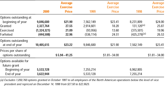 restrictions (i.e., vest) generally over a four-year period. The company awarded 211,200 shares of common stock to 115 key employees in early 2001 in respect of 2000, 134,784 shares of common stock to 43 key employees during 2000, 182,525 shares of common stock to 106 key employees in early 2000 in respect of 1999, 325,750 shares of common stock to 114 key employees during 1999, and 215,400 shares of common stock to 140 key employees during 1998.