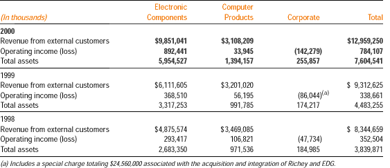 The company is engaged in the distribution of electronic components to original equipment manufacturers and computer products to value-added resellers (VARs). Operating income for the electronic components and computer products segments excludes the effects of special charges relating to the integration of acquired businesses. During the first quarter of 2000, the company redefined its reportable segments to present two distinct worldwide businesses that have different economic cycles, structures, and competitors. Computer products includes North American Computer Products together with UK Microtronica, Nordic Microtronica, ATD (in Iberia), and Arrow Computer Products (in France). The prior years have been restated for comparative purposes. Revenue, operating income, and total assets by segment are as follows: