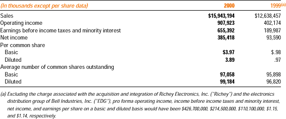 During 2000, the company acquired California-based Wyle Electronics and Wyle Systems (collectively, "Wyle"), part of the electronics distribution businesses of Germany-based E.ON AG (formerly VEBA AG), and the open computing alliance subsidiary of Merisel, Inc. ("MOCA"), one of the leading distributors of Sun Microsystems products in North America. In addition, the company acquired Tekelec Europe ("Tekelec"), one of Europe's leading distributors of high-tech components and systems, and Jakob Hatteland Electronic AS ("Hatteland"), one of the Nordic region's leading distributors of electronic components. The company also acquired a majority interest in the electronics distribution business of Rapac Electronics Ltd., one of the leading distribution groups in Israel, and Dicopel S.A. de C.V., one of the largest distributors in Mexico. The company increased its holdings in Silverstar Ltd. S.p.A. and Consan Incorporated to 100 percent, and acquired an additional 6 percent interest in Scientific and Business Minicomputers, Inc. ("SBM"). The aggregate cost of these acquisitions was $1,249,015,000, which includes 775,000 shares of the company's common stock valued at $27,754,000.