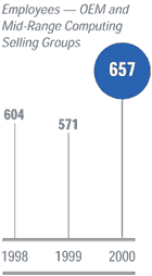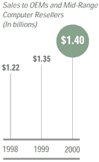 Arrow North American Computer Products (NACP) serves seven distinct customer segments with the broadest range of computer products and design, materials management, configuration, and integration services. Continuing its expansion in 2000, NACP completed the acquisitions of Wyle Systems, a division of the VEBA Electronics Group, and MOCA, formerly the open computing alliance of Merisel, Inc. These acquisitions strengthened Arrow’s presence in two growing markets–OEMs who purchase computer products for industrial applications and value-added resellers who purchase servers, workstations, enterprise software, and configuration services. Strengthening our focus on these growing and profitable customer segments, while decreasing our dependence on the desktop PC and commodity periph-erals markets, has been our strategy and the goal of our acquisitions for the past several years. In the short term, this is resulting in declining sales for the total business, although we are building sales and profits in our targeted customer segments.
