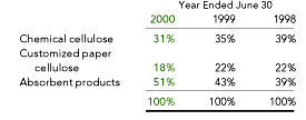 The Company's identifiable products are chemical cellulose, customized paper cellulose and absorbent products. Chemical cellulose is used to impart purity, strength and viscosity in the manufacture of diversified products such as food casings, rayon filament and acetate plastics, as well as thickeners for food, cosmetics and pharmaceuticals. Customized paper cellulose is used to provide porosity, color permanence and tear resistance in automotive air and oil filters, premium letterhead, currency paper and personal stationery. Absorbent products are used to increase absorbency and fluid transport in products such as disposable diapers, feminine hygiene products, adult incontinence products and household wipes and mops. The following provides relative gross sales to unaffiliated customers by product: