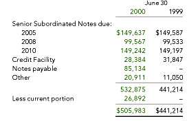 The Company completed a public offering of $150,000 principal amount of 8 1/2% unsecured Senior Subordinated Notes due December 15, 2005 (the 2005 Notes) during November 1995. The 2005 Notes are redeemable at the option of the Company, in whole or in part, at any time on or after December 15, 2000, at redemption prices varying from 104.25% of principal amount to 100.00% of principal amount on or after December 15, 2003, in each case together with accrued and unpaid interest to the date of redemption. The Company completed a public offering of $100,000 principal amount of 9 1/4% unsecured Senior Subordinated Notes due September 15, 2008 (the 2008 Notes) during July 1996. The 2008 Notes are redeemable at the option of the Company, in whole or in part, at any time on or after September 15, 2001, at redemption prices varying from 104.625% of principal amount to 100.00% of principal amount on or after September 15, 2004, in each case together with accrued and unpaid interest to the date of redemption. The Company completed a private placement of $150,000 principal amount of 8% unsecured Senior Subordinated Notes due October 15, 2010 during June 1998. In fiscal 1999, the Company exchanged these outstanding notes for public notes (the 2010 Notes) with the same terms. The 2010 Notes are redeemable at the option of the Company, in whole or in part, at any time on or after October 15, 2003, at redemption prices varying from 104.00% of principal amount to 100.00% of principal amount on or after October 15, 2006, in each case together with accrued and unpaid interest to the date of redemption. The Company has an unsecured credit facility (the Credit Facility), providing for borrowings up to $225,000. The Credit Facility matures May 28, 2002, and on May 28, 2001, borrowing availability reduces to $150,000. The interest rates applicable to borrowings under the Credit Facility are the agent's prime rate or a LIBOR-based rate ranging from LIBOR plus 0.450% to 1.125%. Borrowings at June 30, 2000 were at an average rate of 6.75%. Letters of credit issued through the Credit Facility of $1,659 are outstanding at June 30, 2000. The amount available for borrowing under the Credit Facility is $194,957 at June 30, 2000. The Senior Subordinated Notes are subordinate to the Credit Facility. In connection with the purchase of the nonwoven assets of UPM-Kymmene as of October 1, 1999, the Company entered into four separate promissory notes with the seller. The notes are secured by the stock of certain subsidiaries formed to operate Walkisoft. The principal amount of each note is $22,000 and each bears interest at a rate of 5%. The total principal amount outstanding at June 30, 2000 is $88,000 less the unamortized discount of $2,866, which is based on an imputed interest rate of 7.1%. One note in the principal amount of $22,000 plus accrued interest on all outstanding notes is due on each of the first four anniversaries of the closing date. On March 1, 2000, the Company purchased certain technology from Stac-Pac Technologies Inc. In connection with the purchase, the Company entered into two separate unsecured promissory notes with Stac-Pac Technologies Inc. The principal amount of each note is $5,000 and each bears interest at a rate of 7%. The principal amount of the first note plus accrued interest on both notes is due on March 1, 2001, and the principal amount of the second note plus accrued interest is due on March 1, 2002. The Company has an unsecured term facility, which provides for borrowing up to $15,000 and matures on May 28, 2002. The outstanding balance under this facility was $10,911 at June 30, 2000, at an interest rate of 7.1%. Aggregate maturities of long-term debt are as follows: 2001 $26,892; 2002 $65,774; 2003 $21,093; 2004 $20,670; 2005 $149,637 and thereafter $248,809. Terms of long-term debt agreements require compliance with certain covenants including minimum net worth, interest coverage ratios and limitations on restricted payments and levels of indebtedness. At June 30, 2000, the amount available for the payment of dividends and/or the acquisition of treasury stock was $48,062 under the most restrictive of these agreements. The Company has a revolving credit line of approximately $5,900 with a financial institution at a rate of interest of 4.65% at June 30, 2000. There was no outstanding balance under this revolving line of credit at June 30, 2000. Letters of credit issued through the revolving line of credit of $2,108 are outstanding at June 30, 2000. The revolving line of credit expires April 30, 2001. Total interest paid by the Company for the years ended June 30, 2000, 1999 and 1998 was $37,819, $36,883 and $37,143, respectively. |