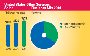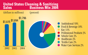 Sales of our United States Cleaning & Sanitizing operations were $1.8 billion in 2004 and increased 6 percent over net sales of $1.7 billion in 2003. Excluding acquisitions and divestitures, sales increased 5 percent in 2004. Sales benefited from double-digit growth in our Kay division, along with good growth in our Institutional division. This sales performance reflects increased account retention through enhanced service, new product and program initiatives and aggressive new account sales efforts. Institutional results include sales increases in all end markets, including restaurant, lodging, healthcare, travel and government markets. Kay's double-digit sales increase over 2003 was led by strong gains in sales to its core quickservice customers and in its food retail services business. New customers, better account penetration, new products and programs and more effective field sales coverage contributed to this sales increase. Textile Care sales increased this year, driven by a significant corporate account gain made early in the year and improved account retention. Professional Products sales, excluding the VIC acquisition, decreased 18 percent as sales growth in corporate accounts was more than offset by the planned phase down of the janitorial equipment distribution business and weak distributor sales. Sales in our Healthcare division were driven by strong growth in instrument care solids and skincare products which were partially offset by the exit of a private label product line. Food & Beverage sales, excluding the benefits of the Alcide acquisition, increased 5 percent primarily due to improved retention and corporate account growth in sales to the dairy, soft drink and agri markets. Water Care had good sales growth in the dairy, canning, meat and food processing markets. Our "Circle the Customer" strategy continues to produce new account gains as our Water Care division works with our Food & Beverage and Healthcare divisions to drive its sales growth. Vehicle Care sales declined due to bad weather, the impact of higher fuel prices on customer purchase decisions and the sale of retail gas stations by major oil companies to smaller franchises, which correspondingly affects distributor sales. Sales of our United States Other Services operations increased 6 percent to $339 million in 2004, from $320 million in 2003. Pest Elimination sales increased with good growth in both core pest elimination contract and noncontract services, such as bird work, the Stealth fly program, one-shot services and its food safety audit business. GCS Service sales decreased slightly in 2004, however, sales grew in the second half of the year as a result of an increase in direct parts revenue.