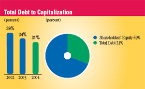 Total debt was $702 million at December 31, 2004 and increased from total debt of $675 million at year-end 2003. This increase in total debt during 2004 was principally due to an increase in our euronotes due to the strengthening of the euro being partially offset by repayments of notes payable made during 2004. As of December 31, 2004 the ratio of total debt to capitalization was 31 percent, down from 34 percent at year-end 2003 and 39 percent at year-end 2002. The lower debt to capitalization ratio in 2004 and 2003 was due to debt repayments made during those years and increasing shareholders' equity levels. |