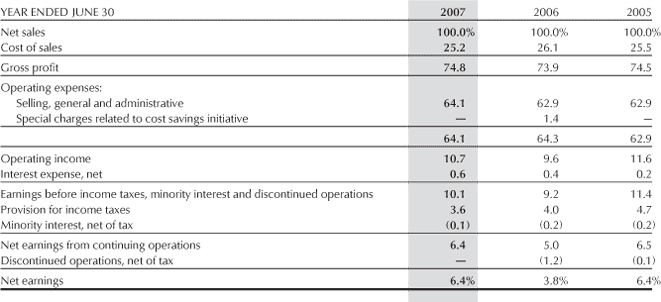 The following table presents certain consolidated earnings data as a percentage of net sales: