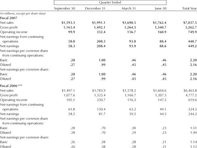 (a) Fiscal 2006 results included $93.0 million, after-tax, or $.43 per diluted share in special charges related to the Company's cost savings initiative and