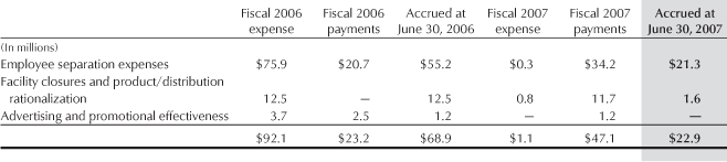 related to facility closings. At June 30, 2007 and 2006,