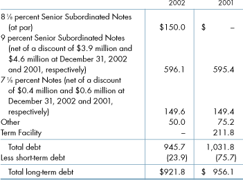 Other debt outstanding at December 31, 2002 totaled $50.0 million,