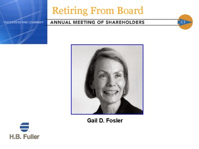GAIL FOSLER JOINED THE FULLER BOARD OF DIRECTORS IN 1992. WITH HER BACKGROUND AS SENIOR VICE PRESIDENT AND CHIEF ECONOMIST OF THE CONFERENCE BOARD, SHE IS A GLOBALLY RESPECTED EXPERT AND ADVISOR AND HAS BEEN A WONDERFUL COUNSELOR FOR OUR COMPANY, IMPARTING HER KNOWLEDGE AND WISDOM IN OUR DECISION-MAKING PROCESSES.