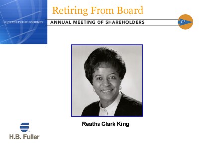 DURING HER 25 YEARS ON OUR BOARD, REATHA CLARK KING HAS CONTRIBUTED SIGNIFICANTLY TO H.B. FULLER’S EVOLUTION INTO A DYNAMIC INDUSTRY AND COMMUNITY LEADER. NOT ONLY HAS SHE SERVED AS A DIRECTOR, BUT SHE HAS ALSO BEEN A TRUSTEE OF THE H.B. FULLER COMPANY FOUNDATION. DURING HER LONG AND FULL CAREER, REATHA HAS BEEN AN INSPIRATION TO MANY IN OUR COMMUNITY AND IN OUR COMPANY, AND WE ARE EXTREMELY FORTUNATE TO HAVE BENEFITTED FROM HER VISIONARY LEADERSHIP FOR SO MANY YEARS.