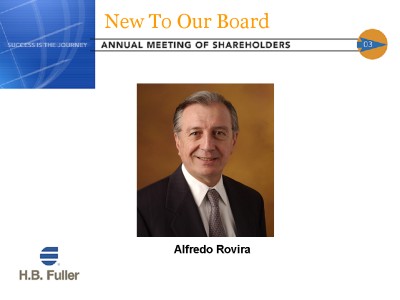 NEW TO OUR BOARD THIS YEAR IS ALFREDO ROVIRA. ALFREDO IS A MANAGING PARTNER OF THE LAW FIRM OF BRONS y SALAS, LOCATED IN BUENOS AIRES, ARGENTINA, AND CHAIRMAN OF THE CORPORATE LAW DEPARMENT THERE. HE HAS EXTENSIVE EXPERIENCE AS AN ARBITRATOR INVOLVING BOTH DOMESTIC AND MULTINATIONAL COMPANIES, IS A LAW PROFESSOR, AND AN AUTHOR OF LEGAL TEXTS. HE ADDS VALUABLE INSIGHTS FROM A REGIONAL AS WELL AS GOVERNANCE PERSPECTIVE, AND WE ARE DELIGHTED TO HAVE HIM ON OUR BOARD. PLEASE JOIN ME IN WELCOMING HIM.