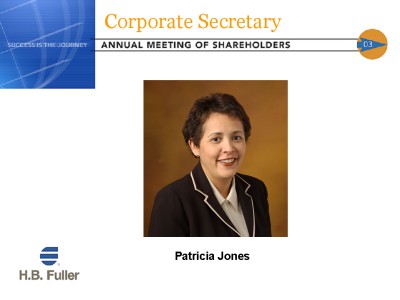 TURNING NEXT TO THE BUSINESS AT HAND, LET ME INTRODUCE PATRICIA JONES. PATTY JOINED H.B. FULLER IN AUGUST AS SENIOR VICE PRESIDENT, CHIEF ADMINISTRATIVE OFFICER AND GENERAL COUNSEL. PATTY IS ALSO CORPORATE SECRETARY, AND IN THIS CAPACITY, WILL ACT AS SECRETARY OF THIS MEETING. PATTY, WILL YOU PLEASE REPORT ON THE GIVING OF NOTICE AND PRESENCE OF A QUORUM?
