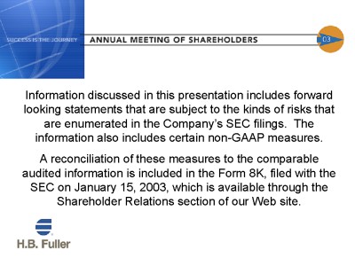 BEFORE I BEGIN MY REMARKS, I WANT TO REMIND ALL OF YOU THAT SOME OF THE INFORMATION THAT I WILL DISCUSS IS CONSIDERED FORWARD-LOOKING OR MAY HAVE BEEN ADJUSTED FOR NONRECURRING CHARGES RELATED TO OUR RESTRUCTURING INITIATIVE OR OTHER SPECIAL ITEMS FOR COMPARABILTY PURPOSES. FOR MORE INFORMATION ON EITHER OF THESE TOPICS, PLEASE REFER TO OUR SEC FILINGS, INCLUDING OUR 2002 ANNUAL REPORT, AVAILABLE ON OUR WEB SITE, WWW.HBFULLER.COM.
