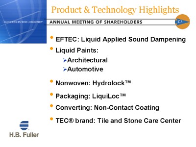 · EFTEC’S LIQUID APPLIED SOUND DAMPENERS INCREASED SALES 25 PERCENT IN 2002 OVER 2001. LASD, AS IT IS CALLED, INSULATES THE FLOOR AND WHEEL-WELLS OF NEW VEHICLES, ELIMINATING OR REDUCING ANNOYING SOUNDS.