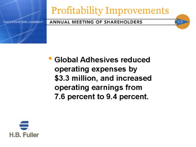 GLOBAL ADHESIVES REDUCED ITS OPERATING EXPENSES BY $3.3 MILLION, AND INCREASED ITS OPERATING EARNINGS FROM 7.6 PERCENT TO 9.4 PERCENT.