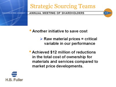 ANOTHER INITIATIVE TO CONTAIN COSTS WAS IN THE AREA OF STRATEGIC SOURCING, OR PROCUREMENT. AS YOU KNOW, RAW MATERIAL PRICES ARE ONE OF THE MOST CRITICAL VARIABLES IN OUR PERFORMANCE. AGAIN, USING TEAMS, WE ACHIEVED $12 MILLION OF REDUCTIONS IN THE TOTAL COST OF OWNERSHIP FOR MATERIALS AND SERVICES COMPARED TO MARKET PRICE DEVELOPMENTS.
