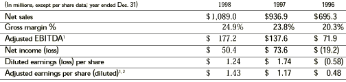 This annual report describes the opportunities and challenges facing Hexcel in a changing business environment. And it outlines the strategies and initiatives we are pursuing to position the company to capitalize on that change. 1 9 9 8 F i n a n c i a l R e s u l t s S e t R e c o r d s Hexcel’s financial results for 1998, our 50th anniversary year, surpassed the records we established in 1997. In fact, it was our third consecutive year of consistent growth. For the first time, the company’s sales exceeded $1 billion. Adjusted EBITDA and adjusted net income both reached records. And adjusted earnings per share increased 22 percent from the record 1997 level. While our 1998 financial performance was strong, the Asian financial crisis and its implications began to affect our business during the year: