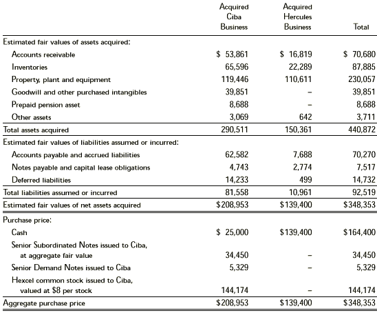 & Acquired Hercules Business The acquisition of the Acquired Ciba Business was consummated pursuant to a Strategic Alliance Agreement dated as of September 29, 1995, among Ciba and Hexcel, as amended (the “Strategic Alliance Agreement”). Under the Strategic Alliance Agreement, the company acquired the assets (including the capital shares of certain non-U.S. subsidiaries) and assumed the liabilities of the Acquired Ciba Business, other than certain excluded assets and liabilities, in exchange for: (a) 18,022 newly issued shares of Hexcel common stock; (b) $25,000 in cash; (c) senior subordinated notes in an aggregate principal amount of $37,476 (the “Ciba Senior Subordinated Notes”), with a fair value of $34,450; and (d) senior demand notes in an aggregate principal amount equal to the cash on hand at certain of the non-U.S. Subsidiaries included in the Acquired Ciba Business (the “Senior Demand Notes”). The total aggregate purchase price for the net assets acquired was approximately $209,000. Hexcel acquired the assets of the composite products division of Hercules on June 27, 1996. The Acquired Hercules Business, which manufactures carbon fibers and prepregs for commercial aerospace, space and defense, general industrial and recreation markets, was purchased for $139,400 in cash. The assets acquired and the liabilities assumed or incurred were: